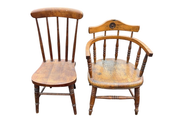 A childs elm Ibex chair with spindle back and flared seat, raised on turned tapering legs; and a childs bentwood oak captains chair with carved medalion to back, having turned spindles & legs. (2)