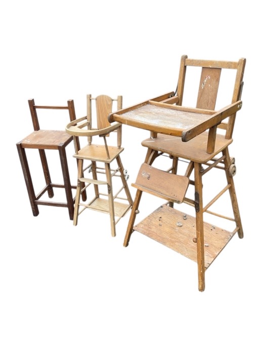 A childs metamorphic beech highchair by Atcraft, converting to a wheeled play table; a similar dolls convertible chair; and a scratch built tall dolls stool. (3)