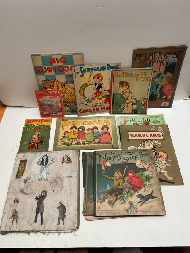 An Edwardian cotton scrapbook with cutouts of Queen Victoria, advertisements, fashion plates, Grave Darling, flowers, animals, etc.; and a collection of childrens books - Hush-a-Bye, Jack & Jill, Babyland, Betty & Babs, etc. (13)