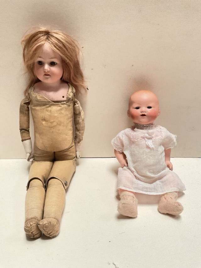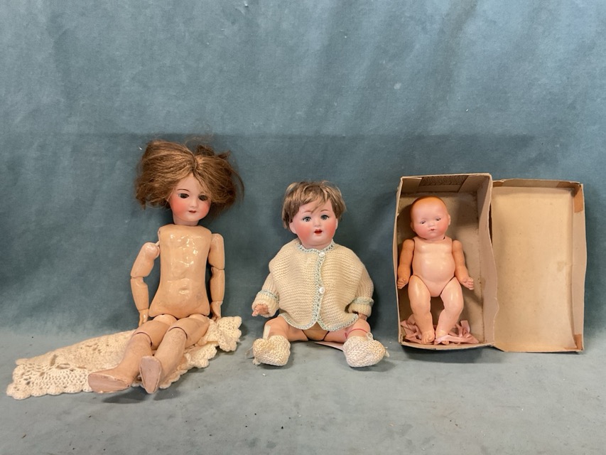A 20s bisque head girl SFBJ doll with composition body, open mouth, sleep eyes and articulated limbs; a Schutzmeister & Quendt bisque baby doll with open mouth, sleep eyes, and “mummy” box; and an Armand Marseille baby bisque doll with closed mouth in original box and dress. (3)
