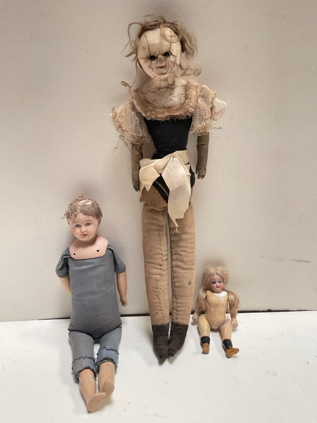 An English 1830s doll, the waxed papier-mâché head & shoulders on a cloth body with leather arms; a C19th boy doll with porcelain head and composition hands & feet, stamped GB Made in England No 6; and a miniature 1890s doll. (3)