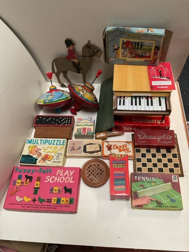 Miscellaneous boxed board games & toys - solitaire, draughts, a Bontempi piano, snap, dominos, spinning tops, an Enid Blyton jigsaw, board tennis & badminton, draughts, cup & ball, etc. (17)