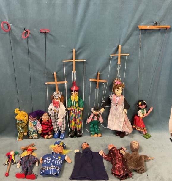 Nine marionettes - a Pelham gypsy girl, a mother with carved wood head and seven clowns; four glove puppets - a Russian Berrie troll policeman; a monkey, Mr Punch and a policeman, and a jesters head rod. (14)