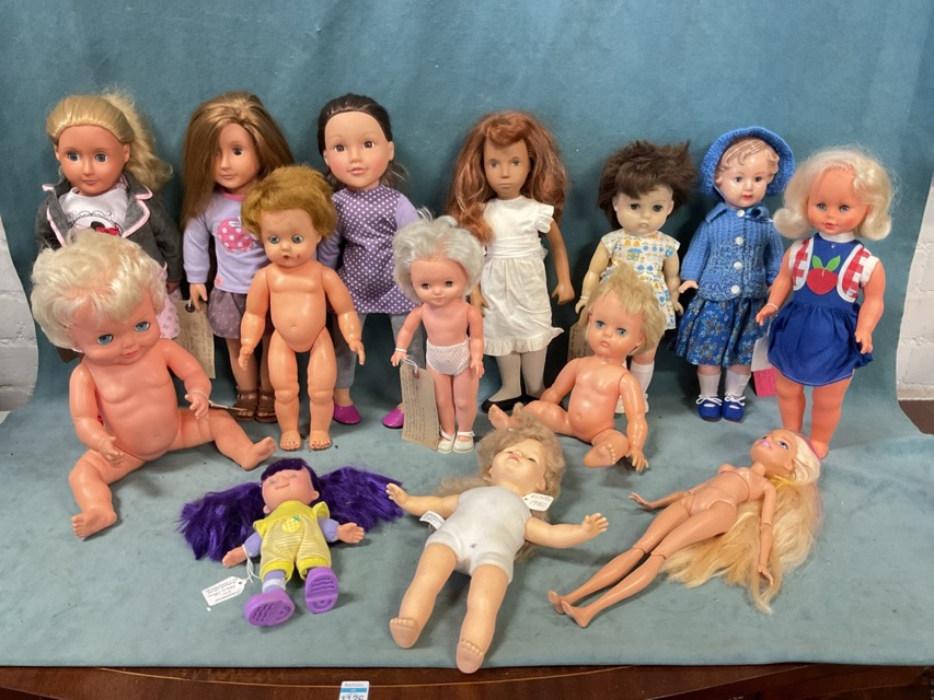 A collection of plastic and cloth bodied dolls - Battat Our Generation, Chad Valley Designa Friend, a 1955 Rosebud, a 1966 Kelly the Sunshine Girl, a 1978 Palitoy baby, a 16in Barbie with articulated torso and limbs, etc. (14)