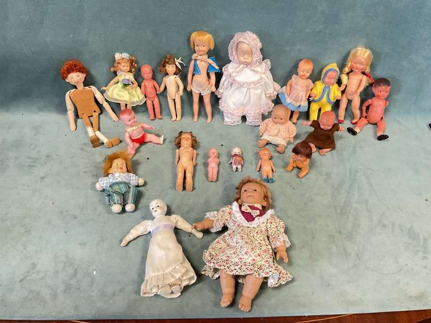 A collection of miniature dolls, 1930s-50s - porcelain, celluloid, plastic, vinyl, handmade wood, various makers including Simba, Sarold, Roddy, Rosebud, JC Toys, etc. (21)