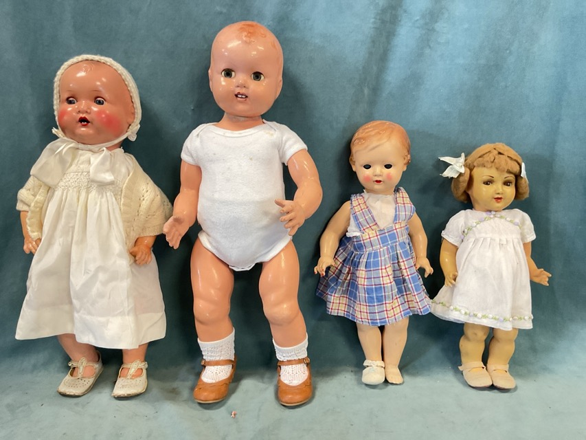 Four dolls - a 20s life-sized German baby with open mouth, sleep eyes and mama box, a similar English example with painted open mouth, a 50s girl with closed mouth, sleep eyes and mama box, and a 20s French walking girl with fixed eyes, mohair wig, and original costume. (4)
