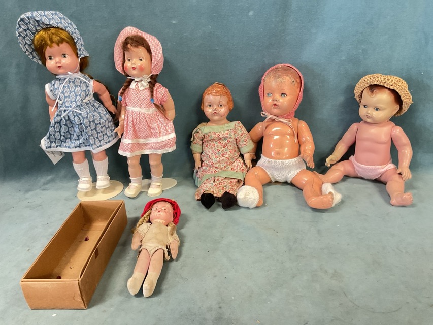 Two 50s Roddy walking dolls with original costumes; a boxed German cloth bodied doll with composition head; a 30s American Horsman Jane doll with original costume; a 40s BND London composition baby doll with sleep eyes and mama box; and another composition baby doll. (6)
