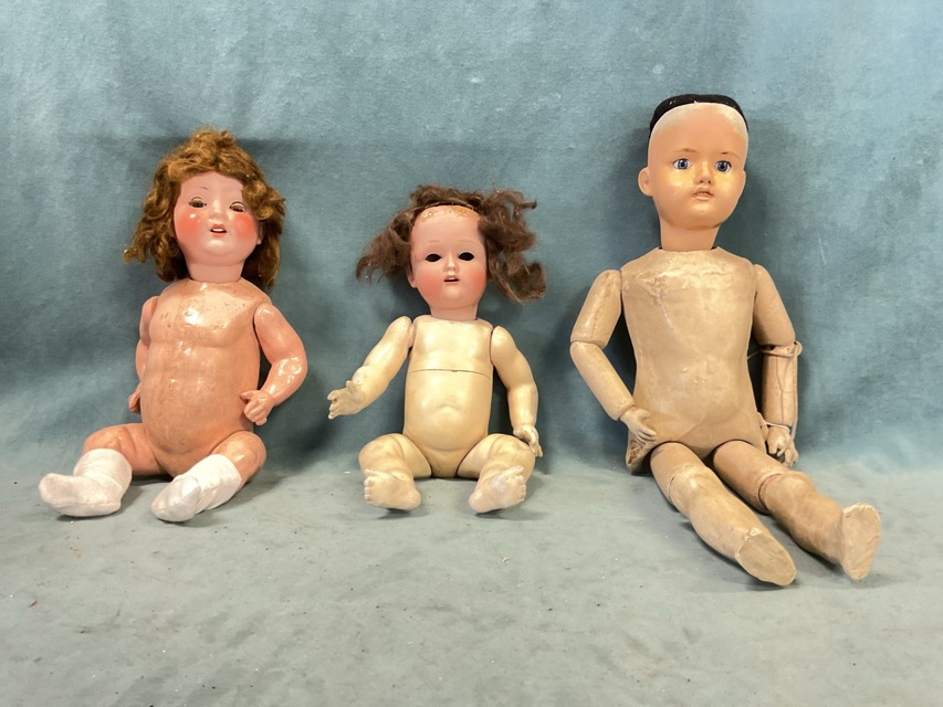 A 20s Schoenau & Hoffmeister Burggrub porcelain head doll with composition body, open mouth, sleep eyes, mohair wig and jointed body; a 20s porcelain head doll with mama box and red W stamp to shoulder; and a 1917 Nunn & Smeed Dolly Dimple with fixed eyes and articulated body. (3)
