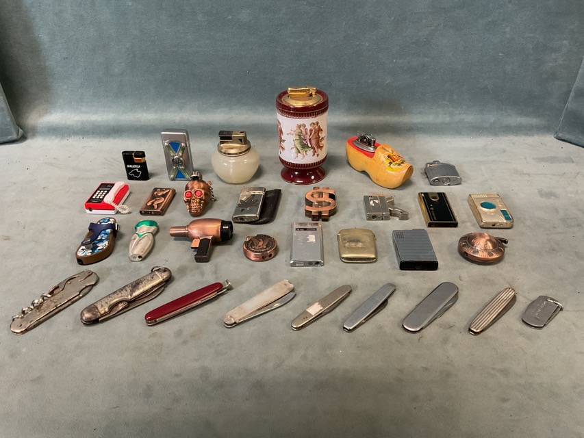 A collection of 22 novelty lighters - a clog, Colibri, a skull, Ronson, a dollar sign, a UFO, a flip-flop, etc; and a collection of 9 penknives - a French waiters friend, pipe smokers, manicure, chromed, etc. (31)