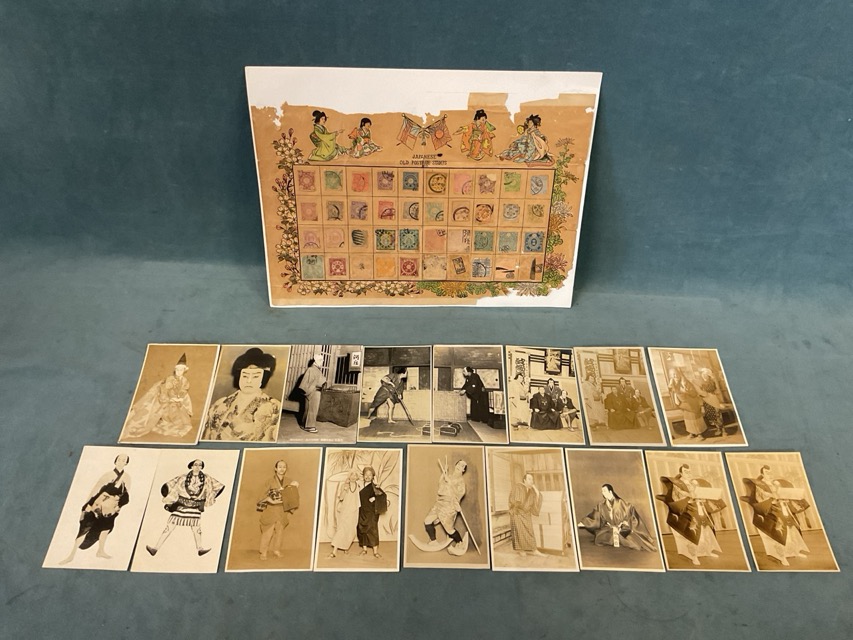 A collection of 17 early C20th Japanese postcard photographs, mostly kabuki actors, comedy, etc.; and miscellaneous late C19th Japanese sen, rin & yen Imperial Japanese Postage stamps. (57)