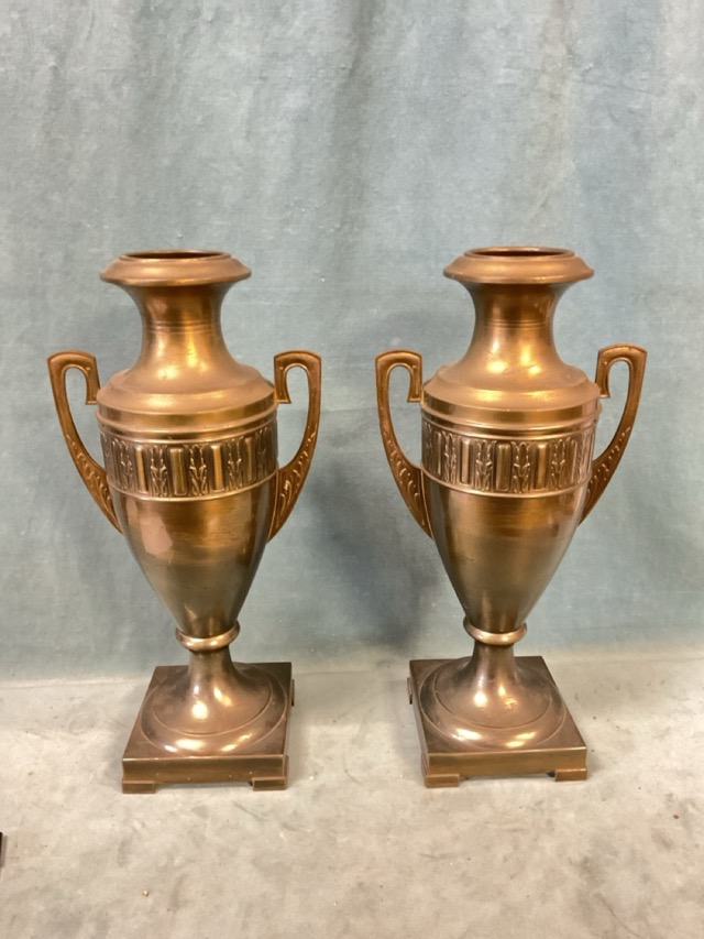 A pair of neoclassical brass urns of trophy form with waisted concave necks and leaf embossed friezes, supported on socles with square plinths. (20.5in) (2)