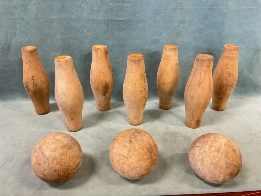 A set of hardwood 'country house' skittles with three 5in balls. (10)