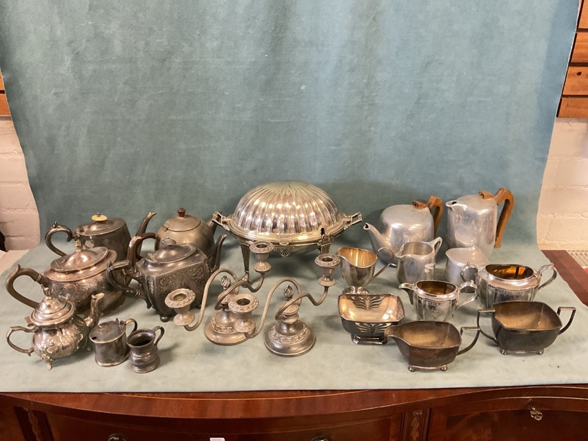 A quantity of silver plate, aluminium & pewter - an engraved oval breakfast tureen, teapots, Piquot Ware, a pair of candelabra, a Victorian quarter gill measure, etc. (A lot)