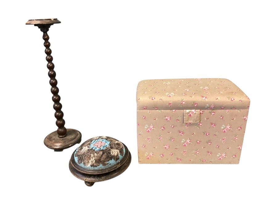 A circular Victorian beadwork footstool in ebonised moulded frame with brass mounts on turned feet; an Edwardian smokers stand with tapering ball column on circular moulded base; and a modern floral upholstered ottoman box stool. (3)