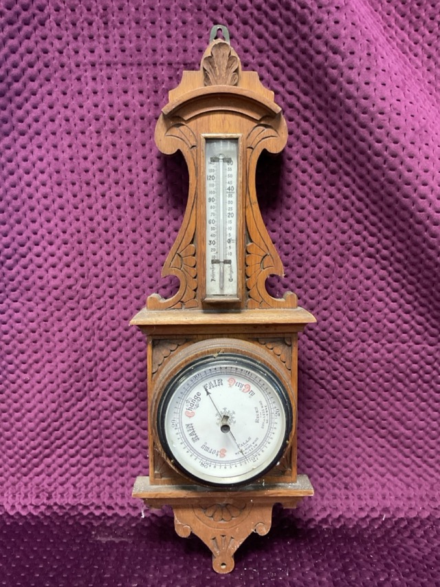 A late Victorian barometer with carved oak case, having circular enamelled dial under bevelled glass with brass bezel, beneath a rectangular thermometer. (23in)