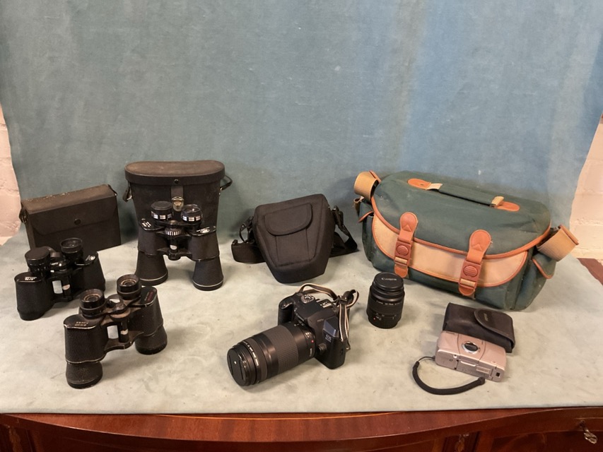A cased Canon EOS 5000 camera with two lenses; a Kodak Advantix C400 camera; a canvas camera bag; and three pairs of binoculars. (6)