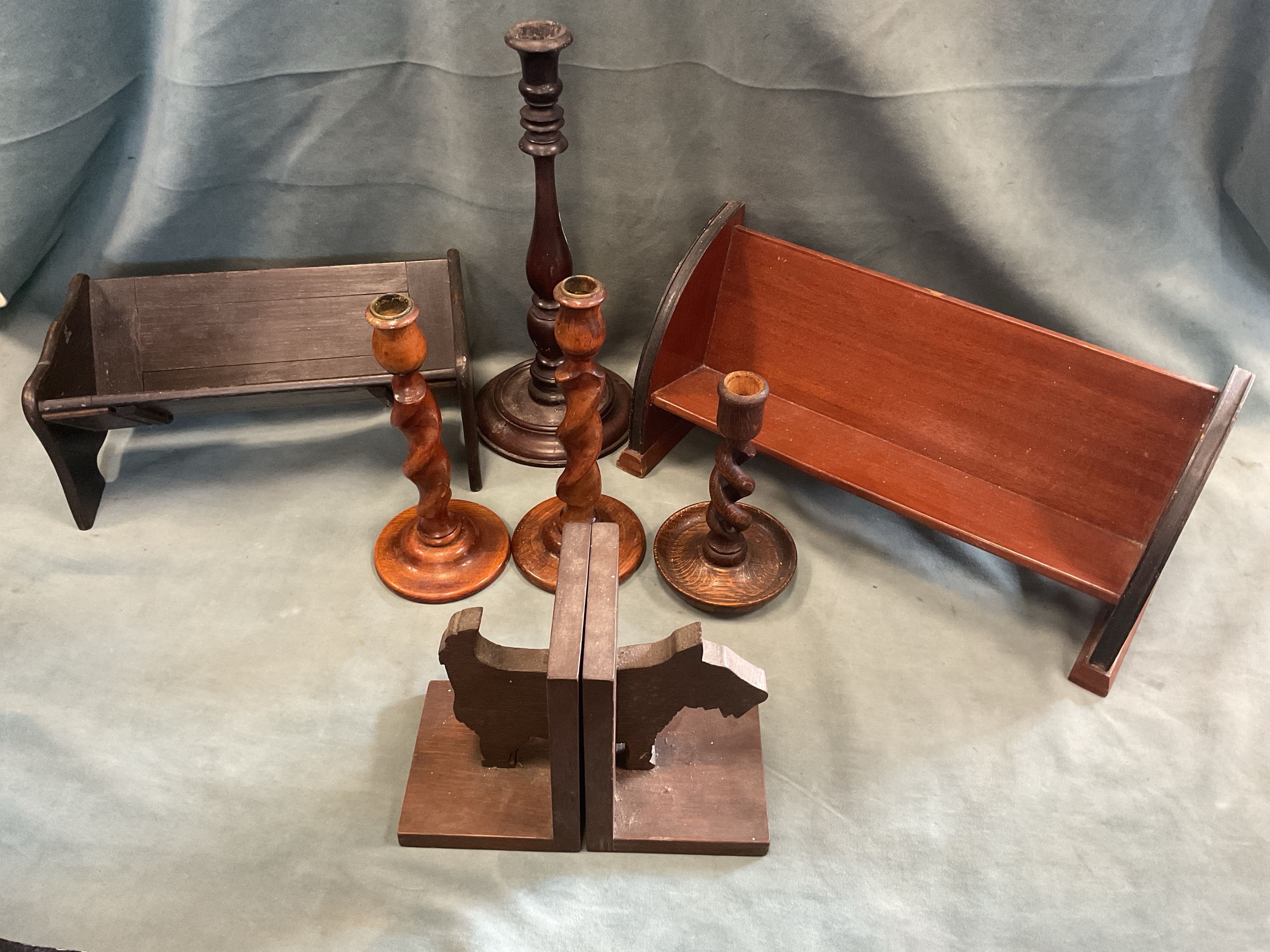 A mahogany table bookshelf with arched ends; an expanding ebonised table bookcase; a pair of barleytwist turned candlesticks; a pair of oak dog book-ends; and two other wood candlesticks. (6)