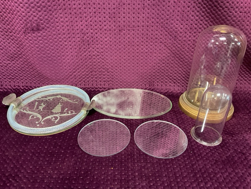 A glass clock dome on circular moulded metal base; a circular engraved glass tray with rope-twist opaline border having silver plated handles; a small glass dome; and three mirror glass panels. (6)