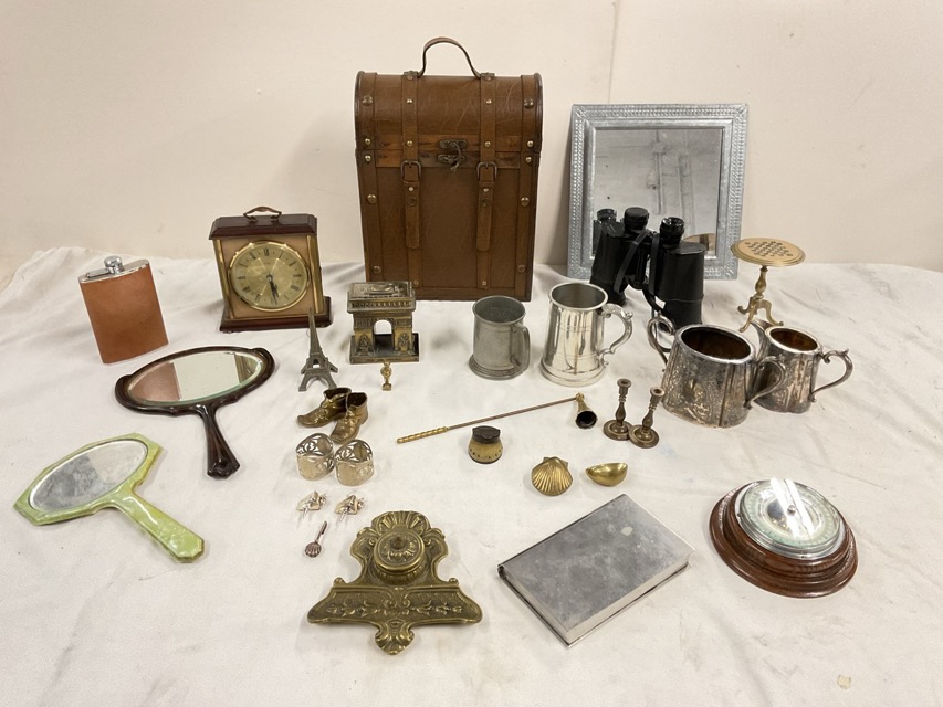Miscellaneous collectors items - silver plate, a bottle carrier, dressing table mirrors, a Swedish steel cigarette box, brass, a Metamec clock, a flask, an oak barometer, Jaguar binoculars, a zinc framed mirror, etc. (A lot)