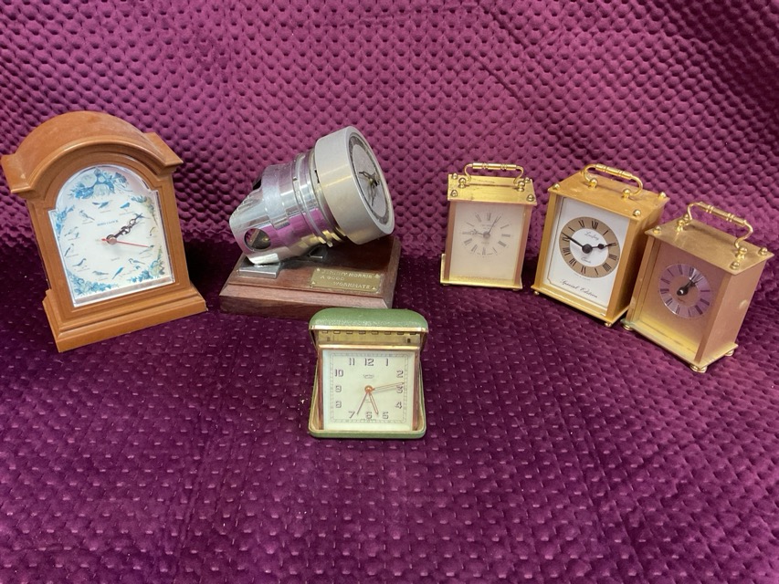 An unusual presentation clock on moulded mahogany stand formed from an engineering part, the plaque reading Johnny Morris A Good Workmate; three modern brass carriage type clocks; a cased Smiths travel clock; and a chirpy bird clock. (6)