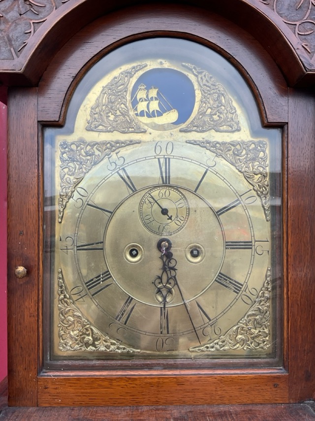 A nineteenth century oak longcase clock with swan neck pediment having fretwork panels and brass ball finials above a glazed door, enclosing a brass dial with roman chapters below a rocking ship panel, with pierced foliate scrolled spandrels, having plain trunk and moulded base. (81.5in)