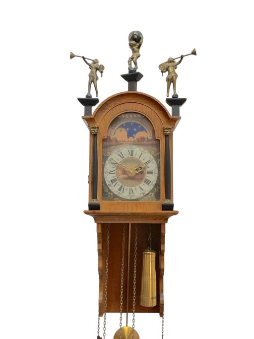A European black forrest type wallclock surmounted by brass Atlas & cherubs, the domed case with ebonised pillar mounts enclosing a painted moon phase dial, having brass weights & pendulum below. (33in)