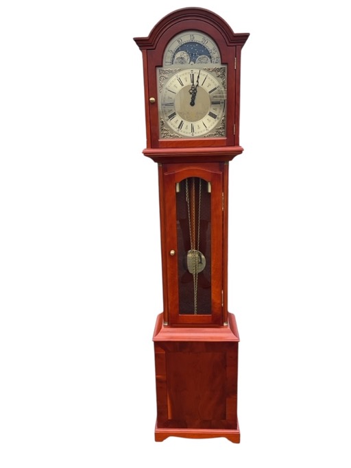 A nineteenth century mahogany loncase clock, the case with swagged harebell inlay to hood & panelled base having marquetry decorated hinged trunk door, the westminster chime movement by James Walker Ltd of London with brass dial and silvered roman chaper ring. (81.75in)