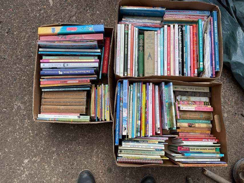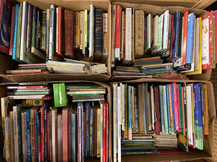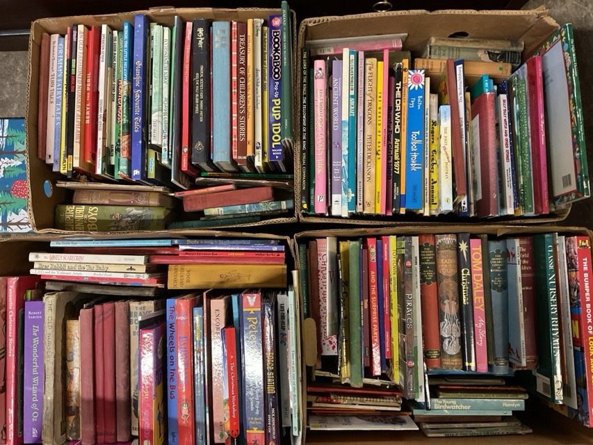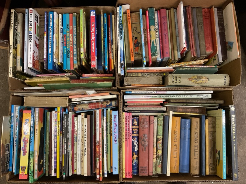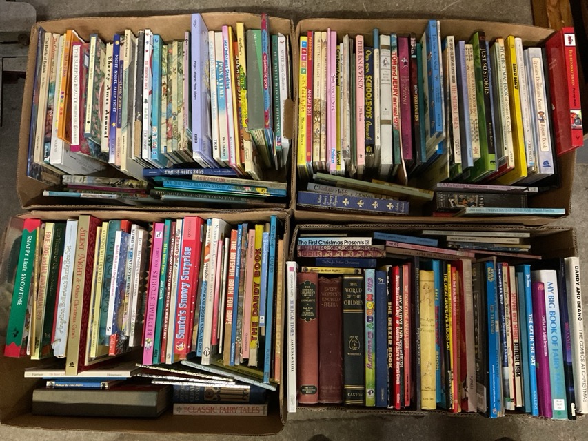 Four boxes of books - childrens stories and reference, dolls houses, toy and doll reference and collecting, Christmas books, fairies, picture books, etc. (approx 200)
