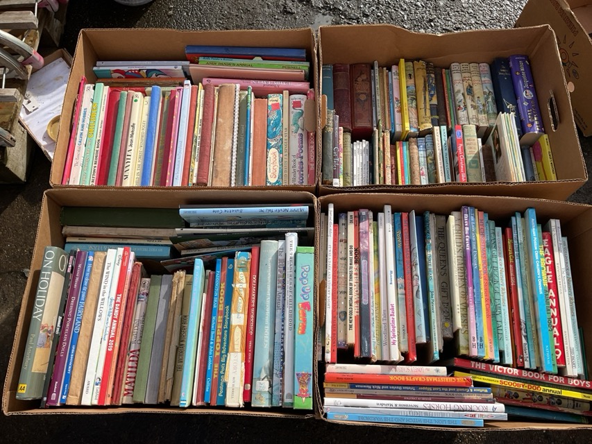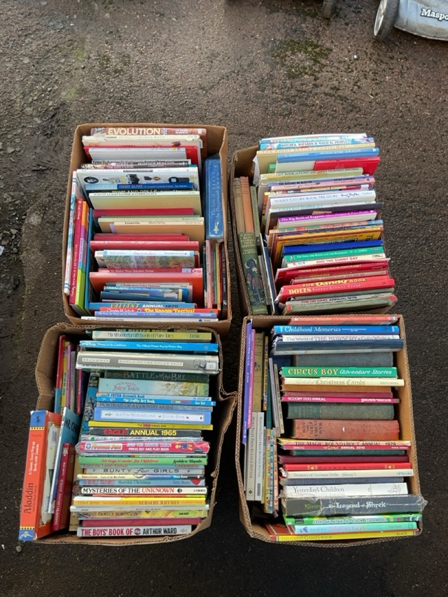Four boxes of childrens books - mainly contemporary, annuals, fairy tales, classic stories, Roald Dahl, Christmas, cartoons, a file of comics - Beano, Dandy, etc, westerns, pop-up books, games, magic, ladybirds, etc. (over 200)