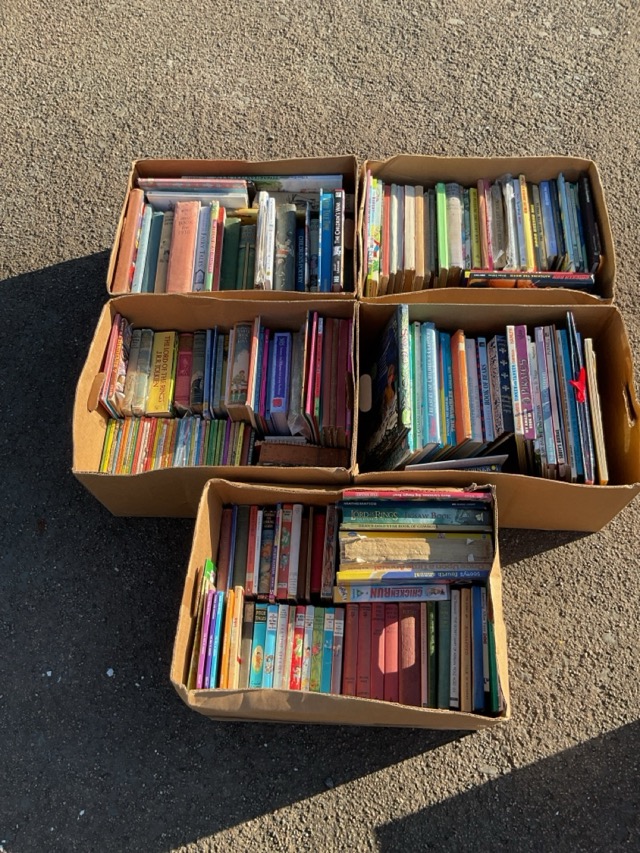 Five boxes of childrens books - fairy tales, annuals, adventure stories, poetry, childrens histories, anthologies, Ladybird books, Tolkien, Beatrix Potter, Enid Blyton, Lewis Carroll, etc. (235)