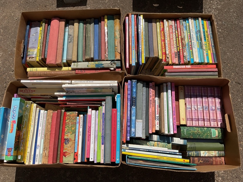 Four boxes of books - childrens stories and novels, cartoons, annuals, fairy tales, poetry, toy and doll collectibles, Enid Blyton, Quentin Blake, Rupert, The Snowman, etc. (approx 120)