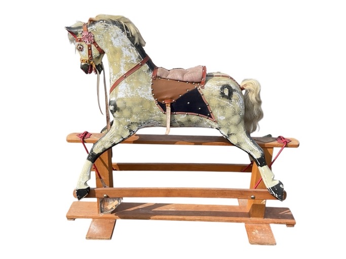 A painted dapple grey rocking horse, with horsehair mane and tail, padded corduroy & leather saddle and leather harness, on a hardwood rocking base. (53.5in x 18in x 47in)