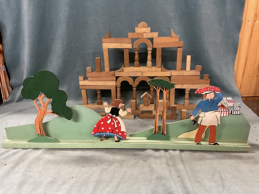 A set of beech architectural building blocks with turned baluster columns, arches, beams, cubes, etc; and a German handpainted cutout nursery diorama of hills with a town and circus, trees, a girl and a baker boy. (2)