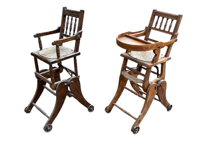 An Edwardian metamorphic high cair with spindled back and solid seat on turned supports, raised on sabre legs with cast iron wheels - converting to a curved rocker; and another similar with semicircular hinged tray. (2)