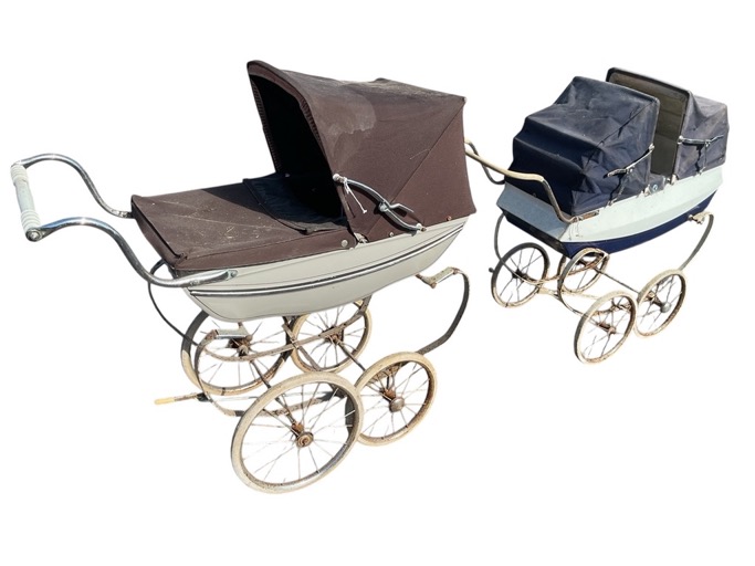 A Silver Cross perambulator with brown canvas cover, raised on metal frame with spoked wheels; and a similar style dolls pram with twin canopied carriage and padded lining. (2)