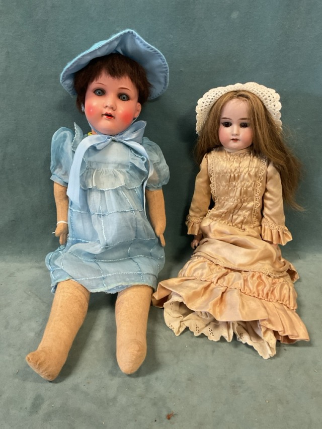 Two Armand Marseille dolls - a 22in composition headed doll 20s doll with sleep eyes, open mouth, cloth body and jointed limbs, retaining her original blue outfit; and an early C20th bisque headed doll with kid body and articulated limbs with bisque forearms and lower legs. (2)
