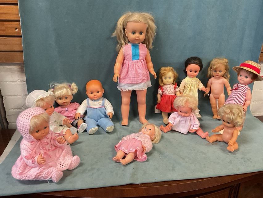 Twelve dolls with sleep eyes, original clothes and jointed limbs - Fisher Price babies, 50s & 60s Roddy & Palitoy type, a Teeny Tiny Tears, a stiff bodied Mattel with painted eyes, etc. (12)