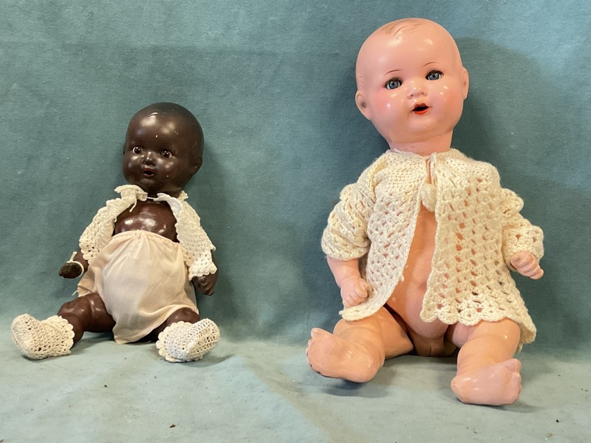 Two 20s Armand Marseille baby dolls - a 14in black with sleep eyes and head mould 518/27 K, and a 20in white with fixed eyes, and head mould 518/52 K, each with moulded hair, open mouth, and jointed limbs. (2)