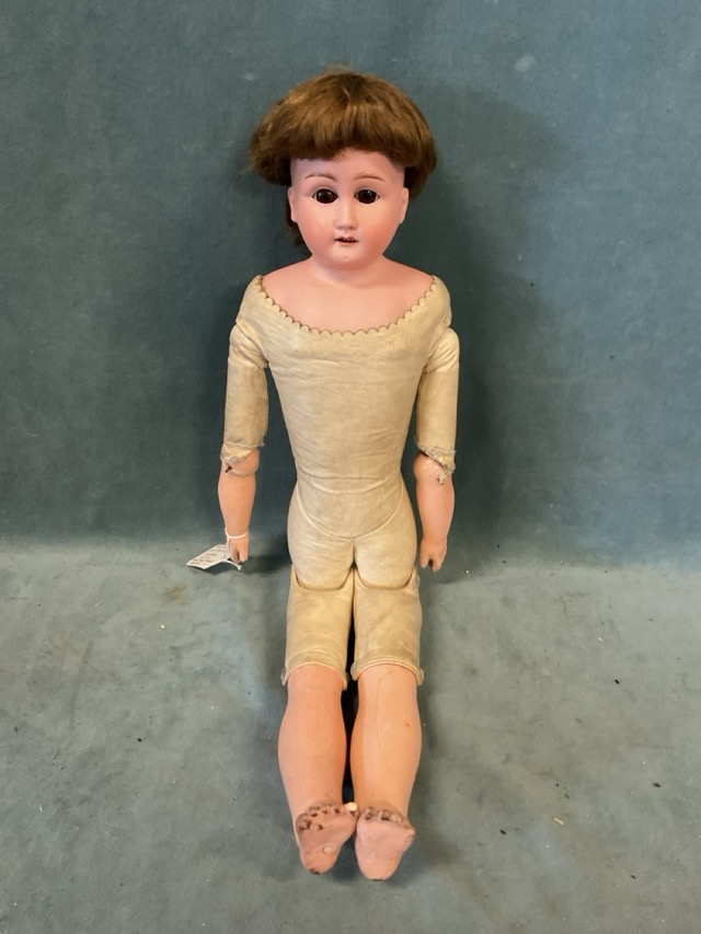A Victorian 25in bisque head German doll by Cuno Otto & Dressel, with human hair wig, sleep eyes, open mouth, kid body, articulated limbs, and composition forearms and lower legs.