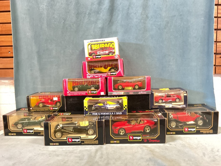A collection of eleven boxed diecast model cars by Burago, Fassi and Hallmark - Alfa Romeo 75, Bugatti type 55, Ford Cobra, Porsche 944, Ferrari Testa Rosa and 948ts, Renault Formula 1, Mercedes Benz 500K Roadster and SSK, Jaguar E Cabriolet, and Dodge Viper. (11)