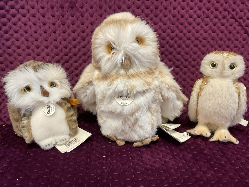 A Steiff Wittie Eule owl with felt feet; another smaller Wittie bird with mottled brown coat; and a limited edition Zauberwald owl, with hard body set with gold sequins, having felt feet. (3)