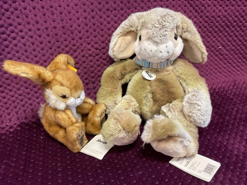 A Steiff soft bodied Schlenkerhase rabbit with striped bandana - 14.5in; and a small bunny with brown fur and felt lined ears - 8in. (2)