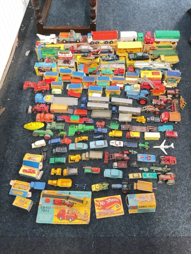 A large collection of diecast model vehicles, many boxed, including lorries, trucks, tractors, diggers, cars, fire engines, a Bat Boat, a Man From Uncle car, a Green Hornet car, horse boxes, pick-up trucks, mostly Dinky, Corgi, Matchbox, etc. (A lot)