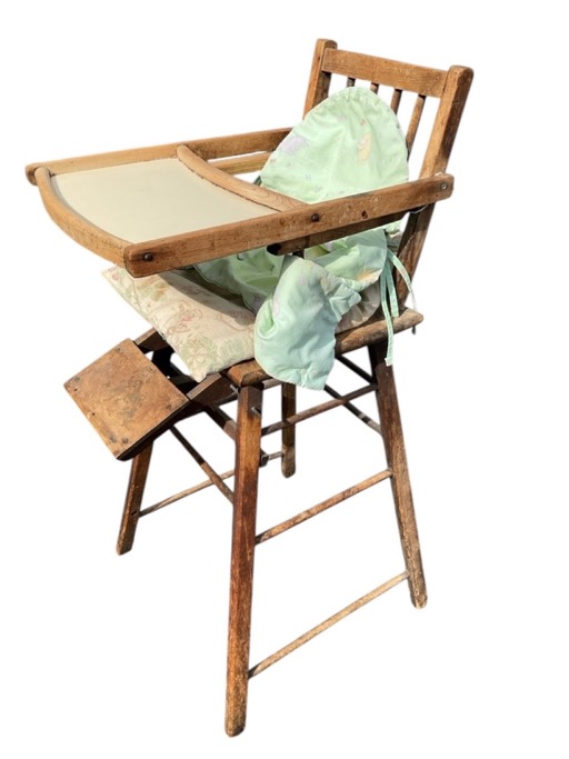 A 40s elm high chair with rectangular spindle back, solid seat, hinged tray and rectangular footrest, raised on splayed square legs joined by stretchers. (14.5in x 20in x 39in)