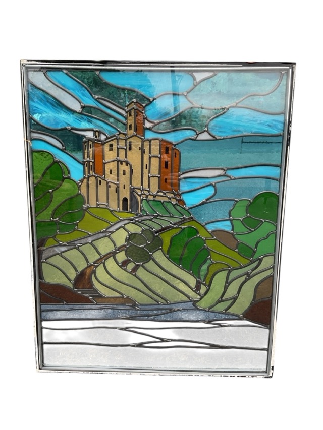 A leaded stained glass panel depicting Warkworth Castle, encased in glass panes, fitted for a door frame, unsigned. (23.5in x 29.5in)