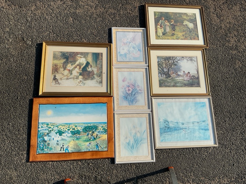 Eight miscellaneous framed prints - Victorian style, a set of three floral, continental harvesting, etc. (8)