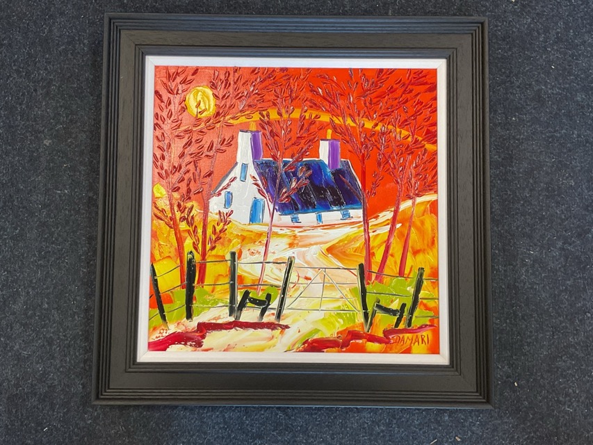 John Damari, oil on canvas, a cottage at dusk with trees, titled Sunset at Mary’s Wee Croft, Uisken Beach, Isle of Mull to verso, signed and framed. (15in x 15in )