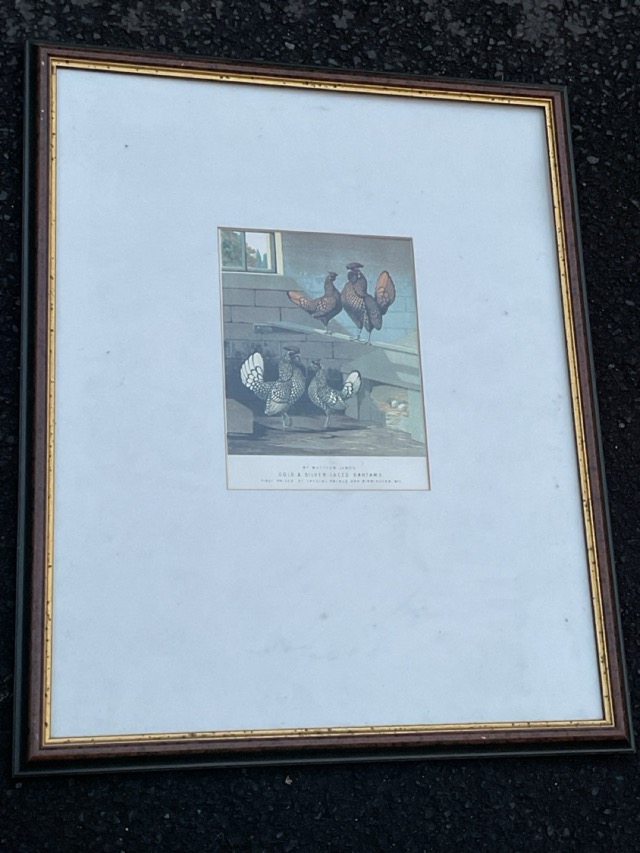 Victorian Baxter style coloured print, depicting hens, titled Mr Matthew Lends Gold & Silver Laced Bantams, First Prizes at Crystal Palace & Birmingham 1871, mounted & framed. (7.25in x 9.75in)