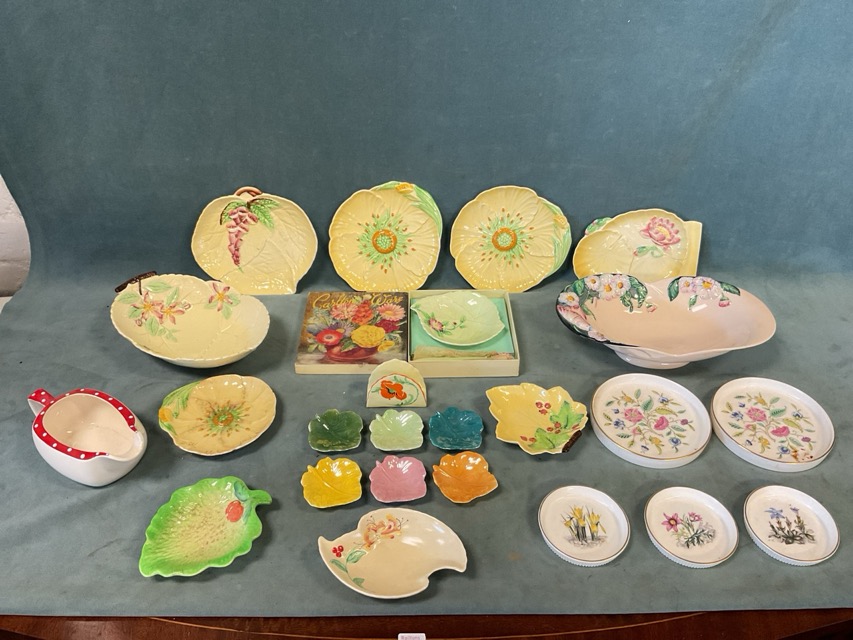 Miscellaneous handpainted ceramics - Carlton Ware, bowls & dishes, Midwinter, leaf dish, Minton, butter dish & knife, Royal Worcester, polka dot sauceboat, etc. (24)
