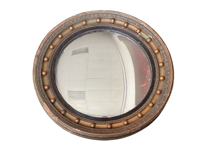 A circular regency style convex gilt framed mirror, the gesso scroll moulded frame with ribbon moulding having applied balls, with interior ebonised ribbed slip. (19.5in dia)